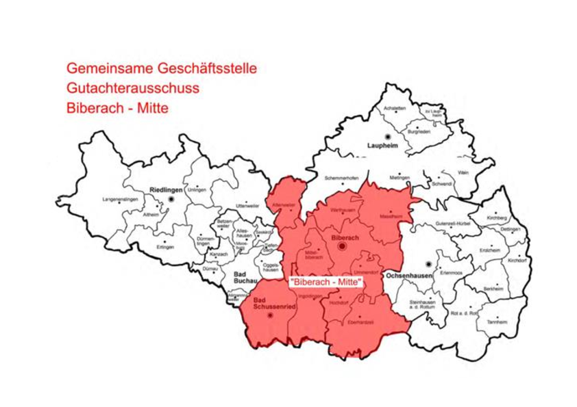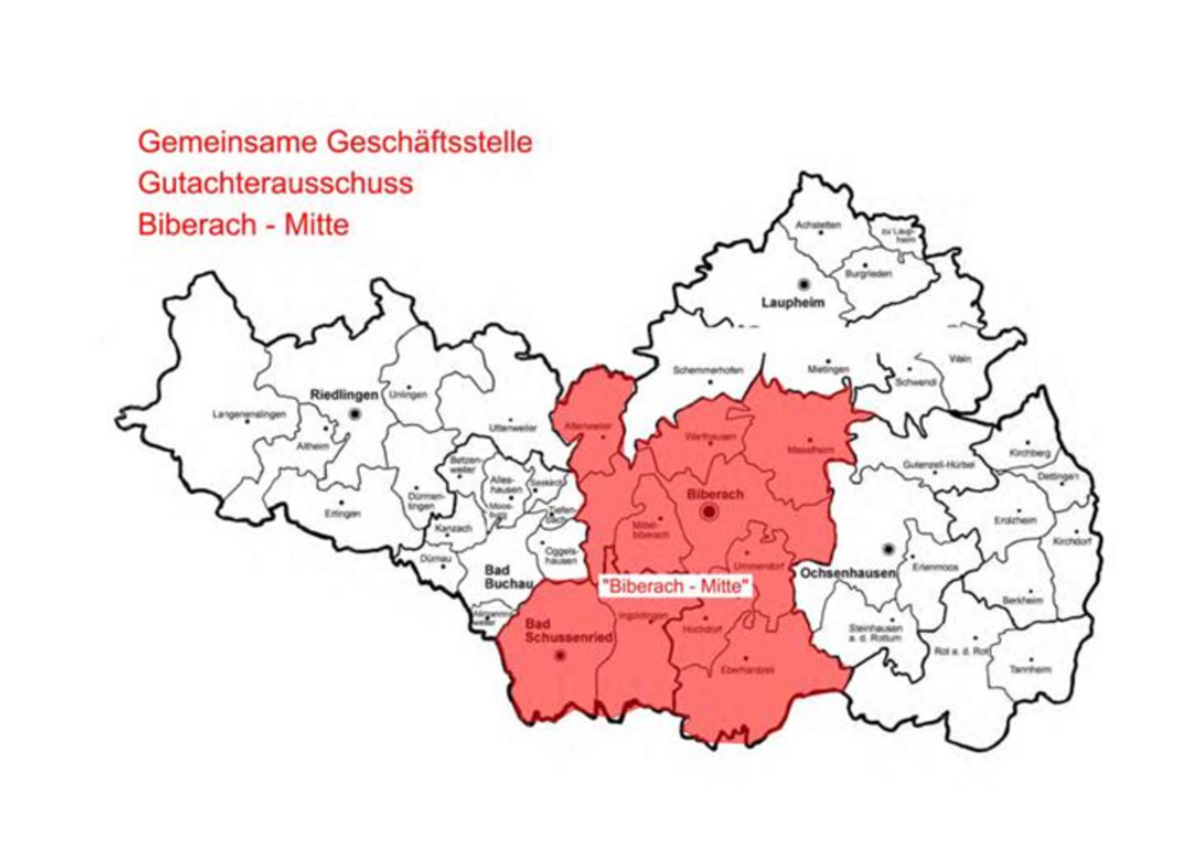 Zum 01.01.2021 wurde durch den Zusammenschluss der Städte Biberach und Bad Schussenried sowie den Gemeinden Attenweiler, Eberhardzell, Hochdorf, Ingoldingen, Maselheim, Mittelbiberach, Ummendorf und Warthausen der gemeinsame Gutachterausschuss Biberach-Mitte gegründet.